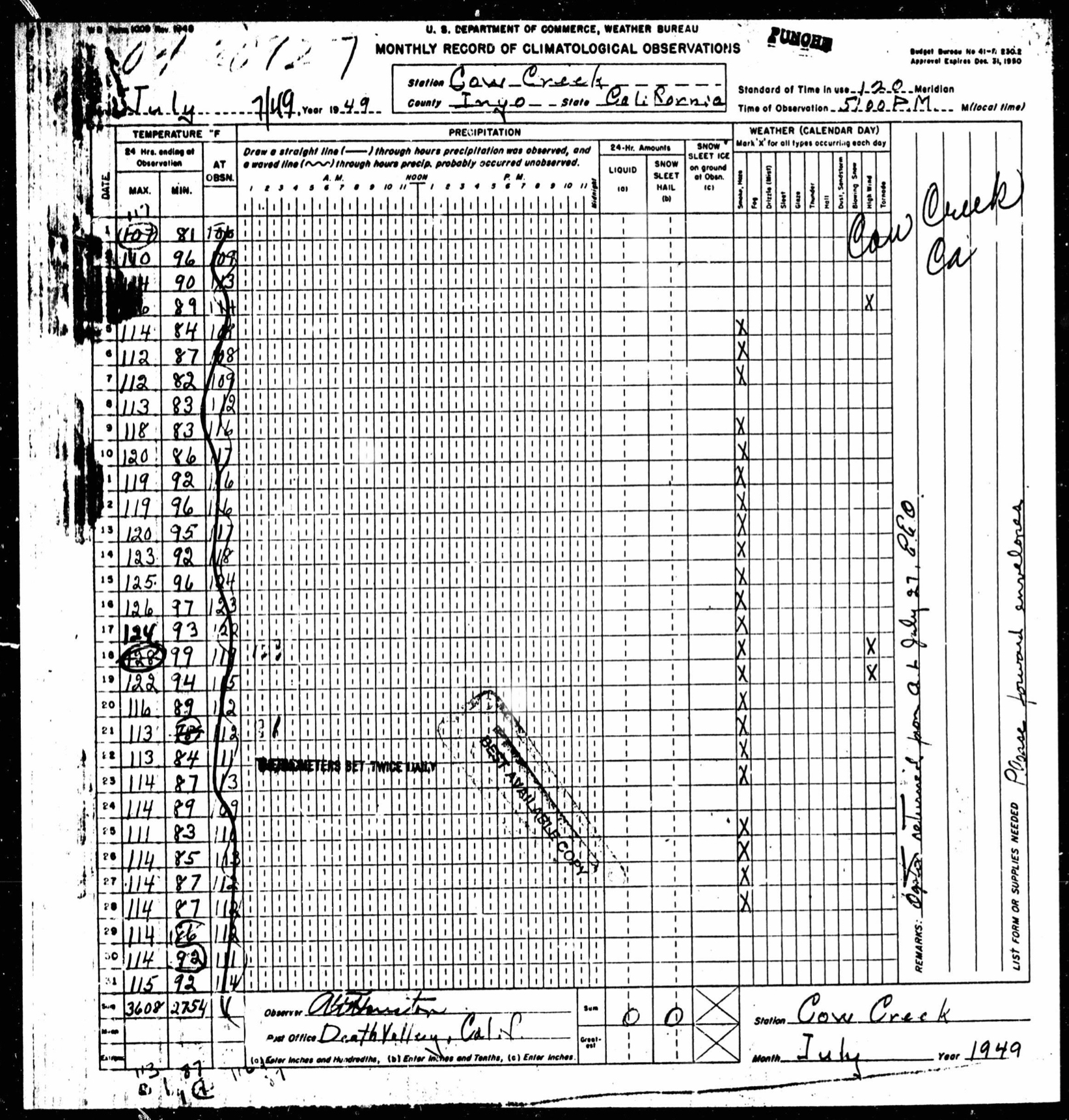 There was one recorded maximum at Cow Creek from 1934 to 1961 that was higher than 126F. On July 18, 1949, the observer entered “128” for the maximum temperature, and this report made its way into the July 1949 issue of Climatological Data. Here is the associated Cow Creek climate form: