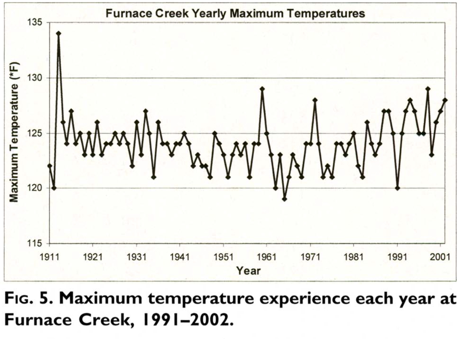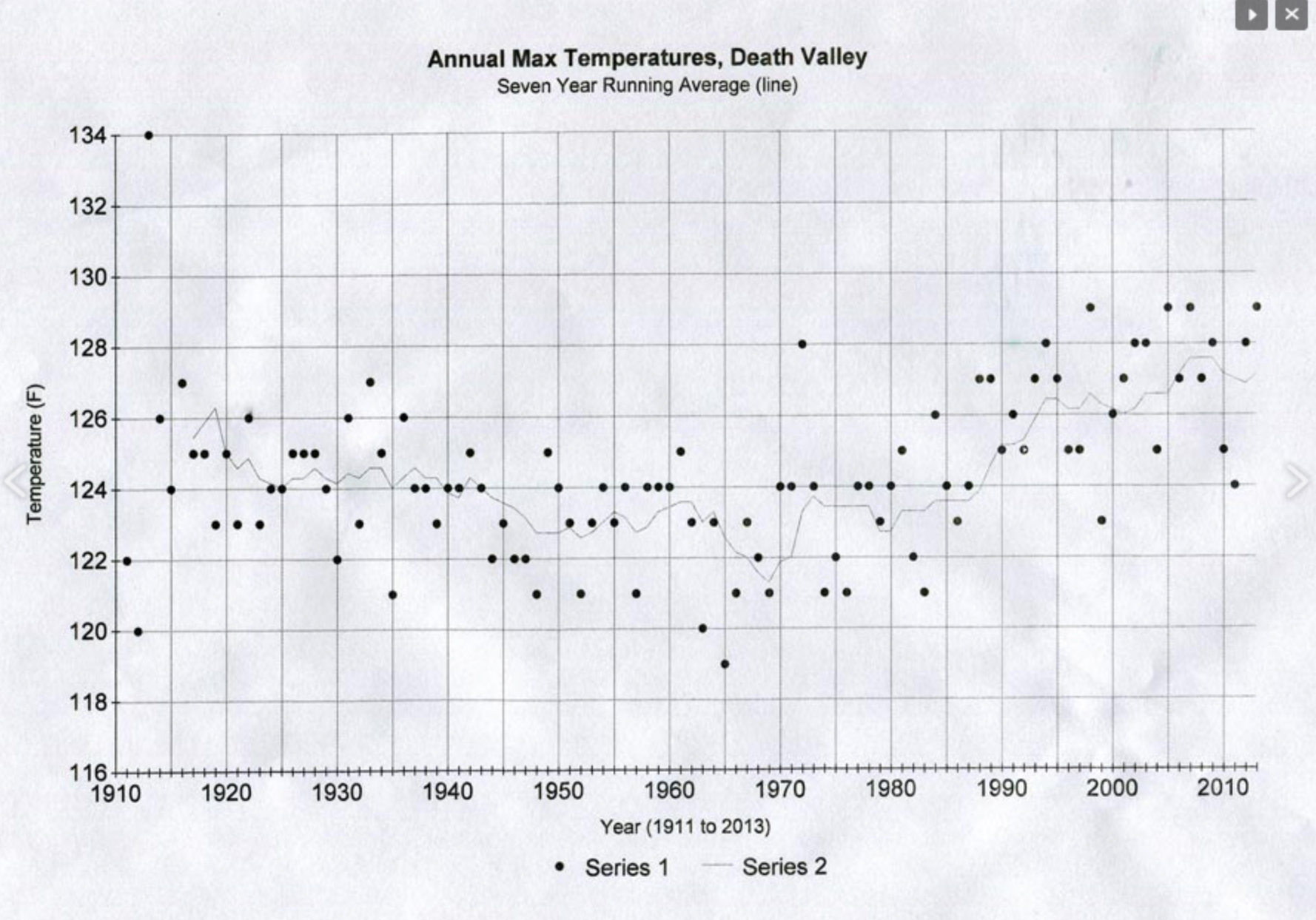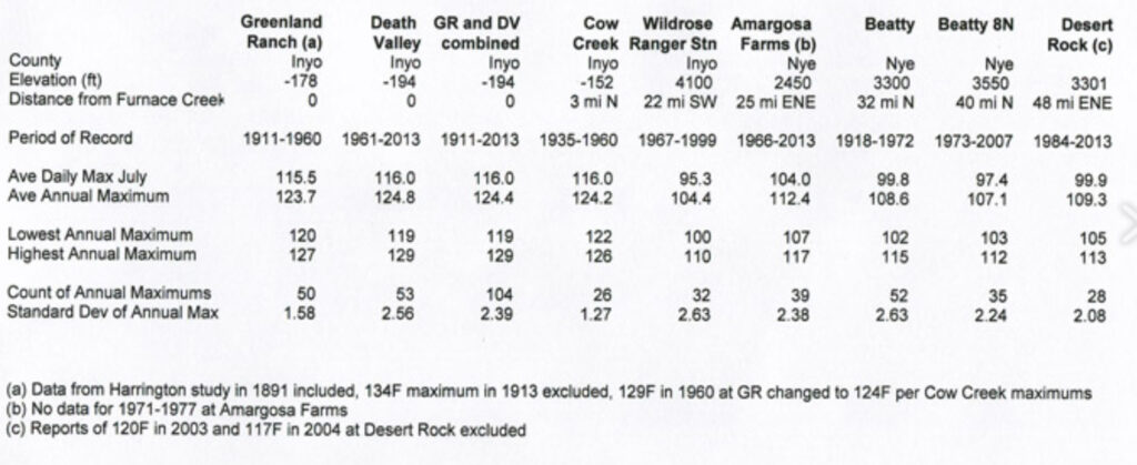 A professional article is in the works (by myself, Dr. Roy Spencer and Dr. John Christy) which discredits the maximum temperature reports from Greenland Ranch in Death Valley in July, 1913. (And here is that article!) This includes the famous 134F temperature observation of July 10, 1913. Currently the 134F report is officially recognized as the record highest temperature for the United States and the world. See this link and this link to the World Meteorological Organization (WMO) web site for additional information.