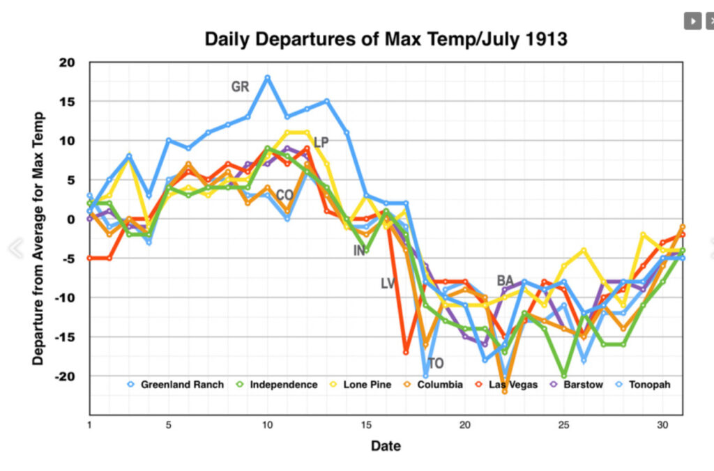 In contrast to the surrounding stations, which generally cluster around a similar departure value day-to-day, the Greenland Ranch departures run a consistent 5-to-10 degrees F higher comparably from about July 5th to July 13th, 1913. The air mass covering the region was never hot enough to support maximums near or above 130F in Death Valley during the first two weeks of July, 1913.