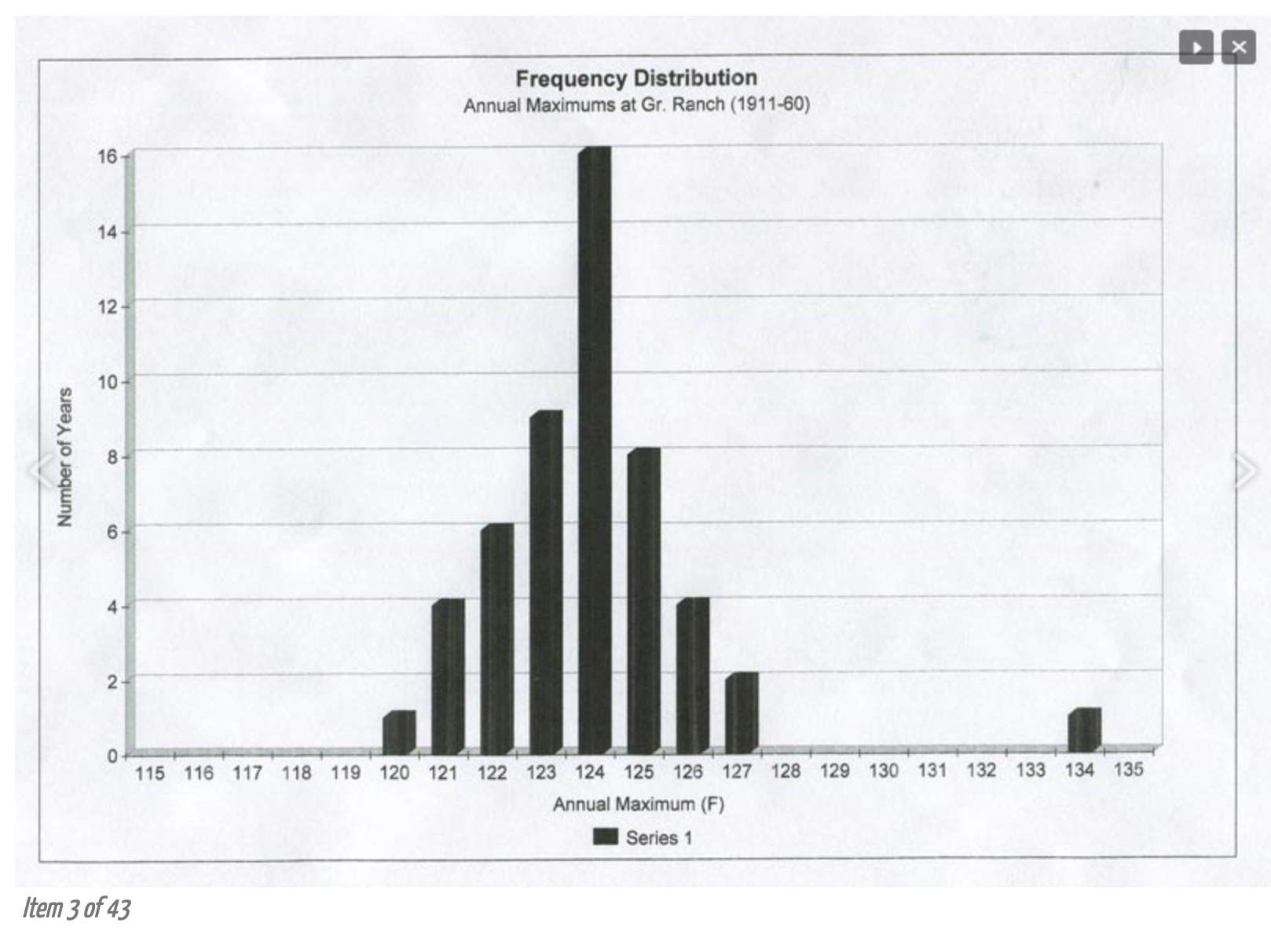 The frequency distribution chart on the right incorporates only annual maximums from Greenland Ranch, 1911 to 1960. The maximum of 134F in 1913 was included, primarily just to show how spurious the value is. There was a reported maximum of 129F at Greenland Ranch in July, 1960. This record is included in the WRCC tables for Greenland Ranch and Death Valley (provided near the top of this entry). My charts above do not show this 129F maximum because it is not valid. More on this below.