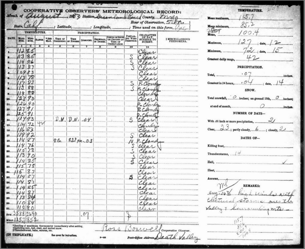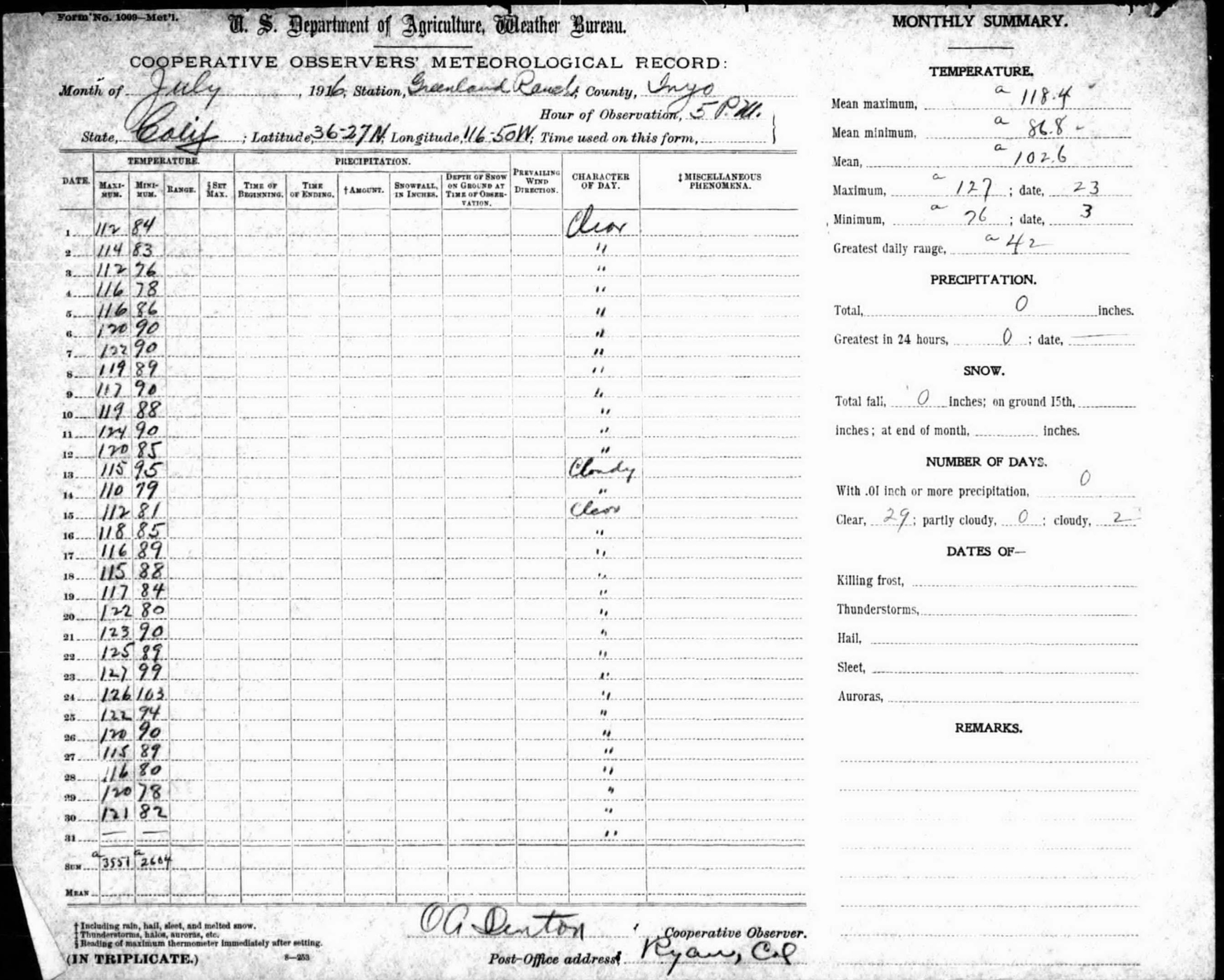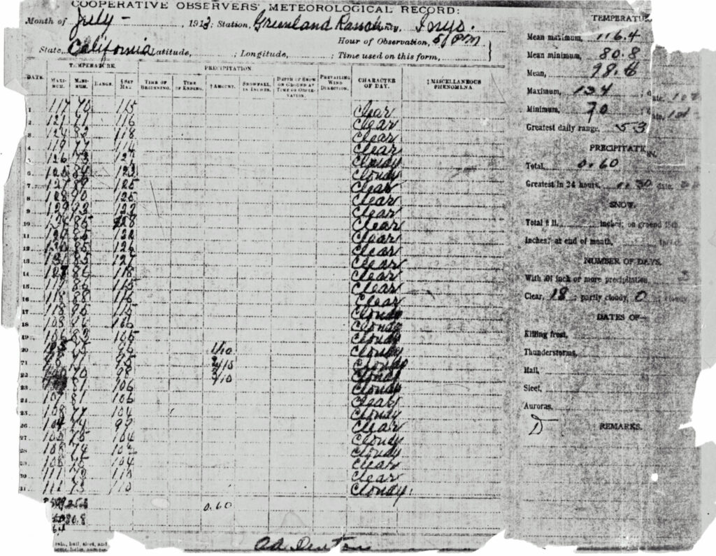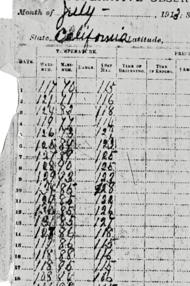 The highest recorded maximum temperatures from the Greenland Ranch station were made by Oscar Denton in July 1913. Here is a cropped and blown-up look at Oscar’s entries from July 1 to 18, 1913, from the carbon copy form which was located in old ranch files by DV historian David Woodruff.