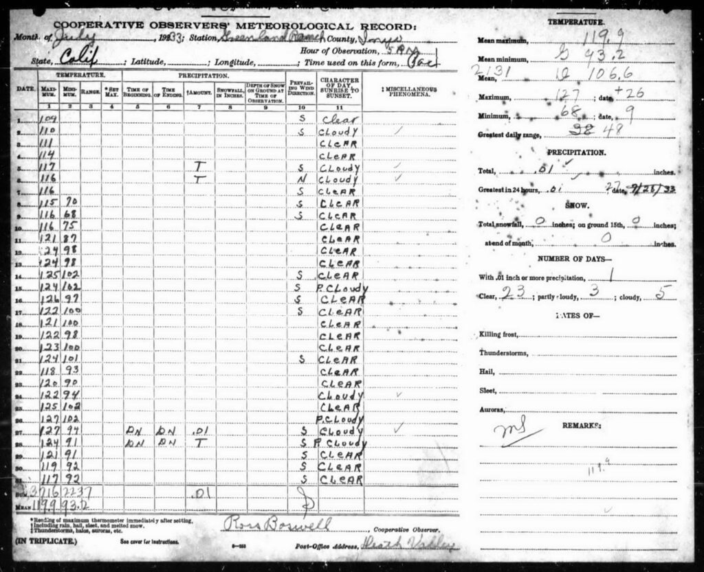 Next on the list of highest Greenland Ranch maximums (outside of 1913 and 1960) is 127F. This temperature was recorded on July 23, 1916; on July 26 and 27, 1933; and on August 12, 1933. Oscar Denton signed the form for July 1916, but the handwritten entries on the form were not made by Denton. It is possible that his supervisor re-entered the observations on a second form that was ultimately mailed to the USWB. Ross Boswell was the Greenland Ranch observer during the very hot months of July and August, 1933. The climate forms for these 127F reports are provided below.