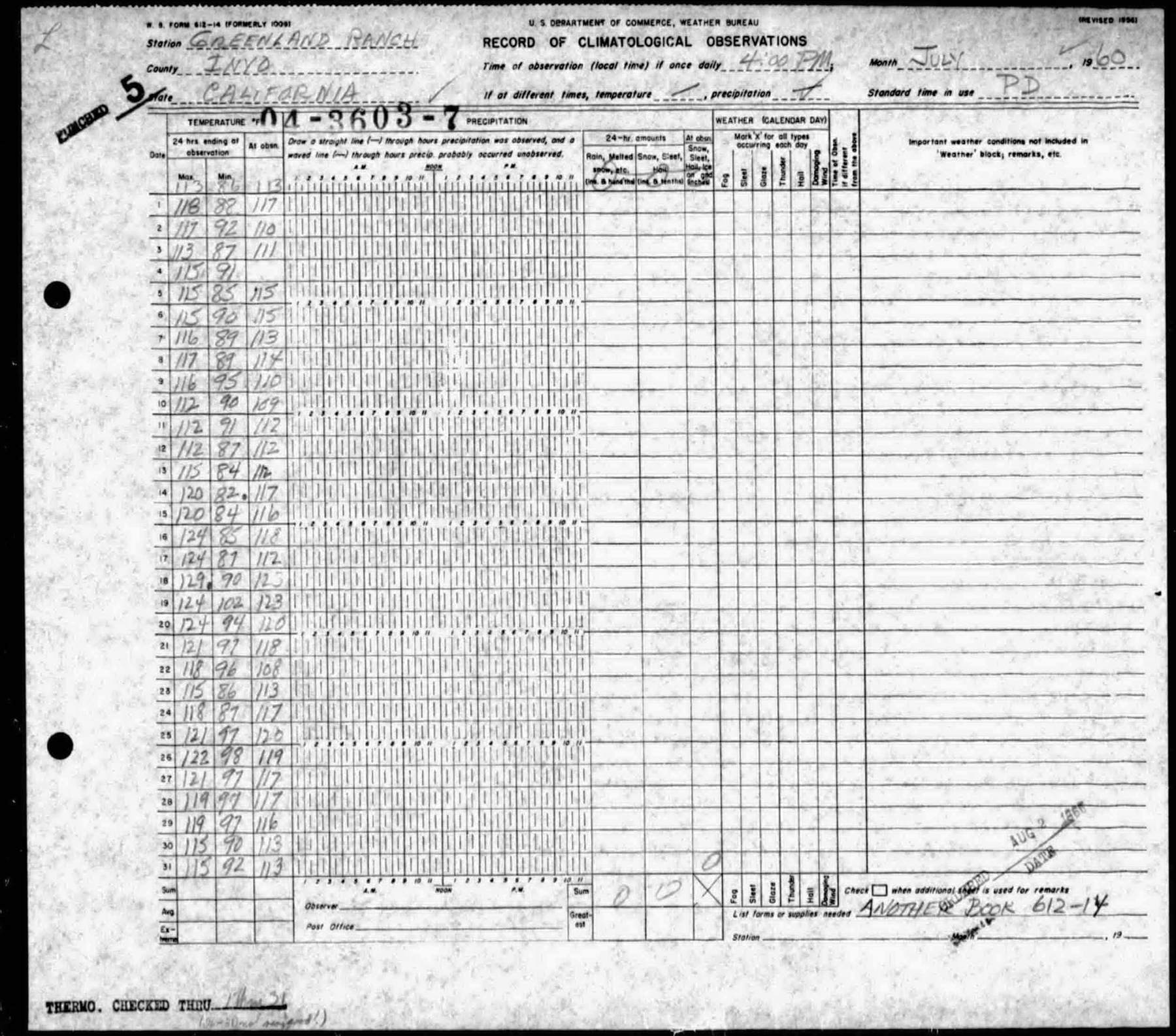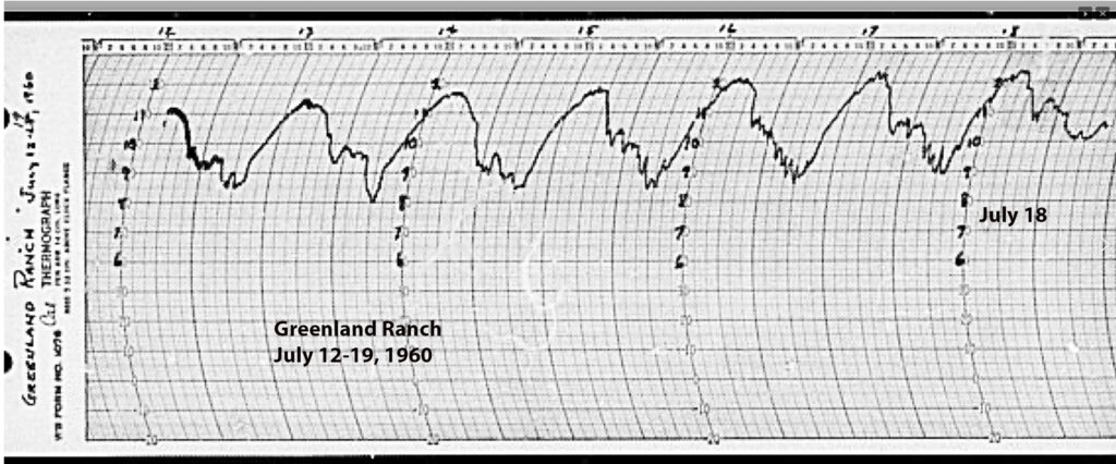 This report of 129F is not correct. The thermograph chart (below) from Greenland Ranch for July 12-19, 1960, shows a high temperature of 124F on July 18th. The temperature trace is about as high on the 18th as it was on the 17th, when the observer entered a high of 124F. The daily maximums at nearby Cow Creek also show that the 129F maximum for the 18th is suspect. For more details, scroll down to the bottom of this entry. It is likely that the Greenland Ranch observer was just not careful enough when taking the readings on July 18th, and a max temp of 124F on the thermometer wound up as 129F on the form. There have been no official steps to correct the 129F observation on July 18, 1960, as of October, 2025.