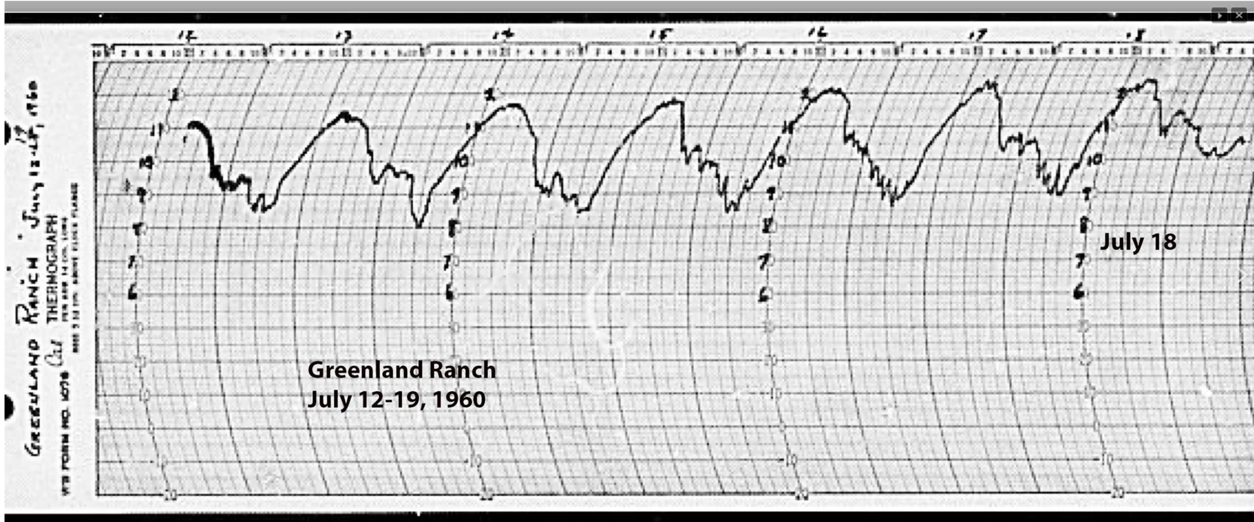 Ironically, the presumably misread and bad observation of 129F at Greenland Ranch in 1960 (when its thermograph showed only 124F) was also on the date of July 18th. The 129F in 1960 at Greenland Ranch has not yet been officially adjusted downwards!