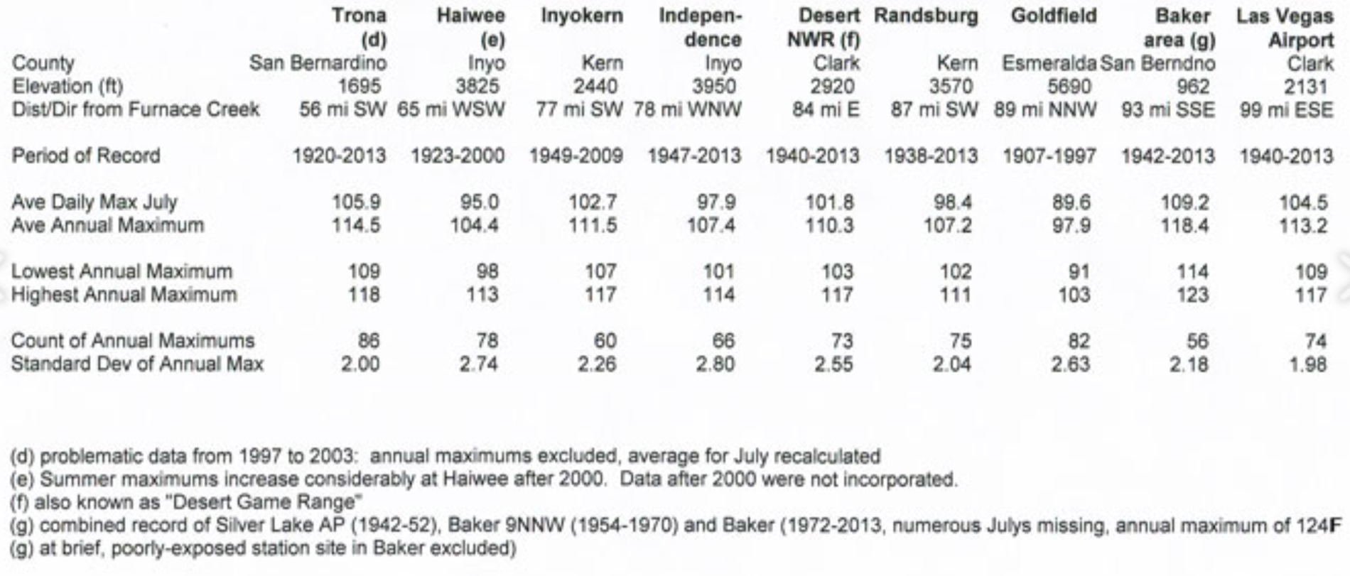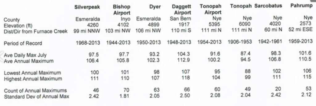 A similar weather station was in place at Badwater for the Julys of 1959, 1960 and 1961. I don’t know what side of Badwater Road it was on! Maximums reached 129F in 1959, 128F in 1960, and 128F in 1961. These maximums were generally about 3 – 4 degrees F higher than the maximums registered by the Furnace Creek stations. See C.A. Scott’s study “Defining Extreme Desert Environments With Microclimatological Measurements” (1962) and the great study by Hunt et al. (1966). The Badwater maximum temperatures appear to be reliable and are supported by the data from Greenland Ranch and Cow Creek (1959 and 1960) and Death Valley (1961).
