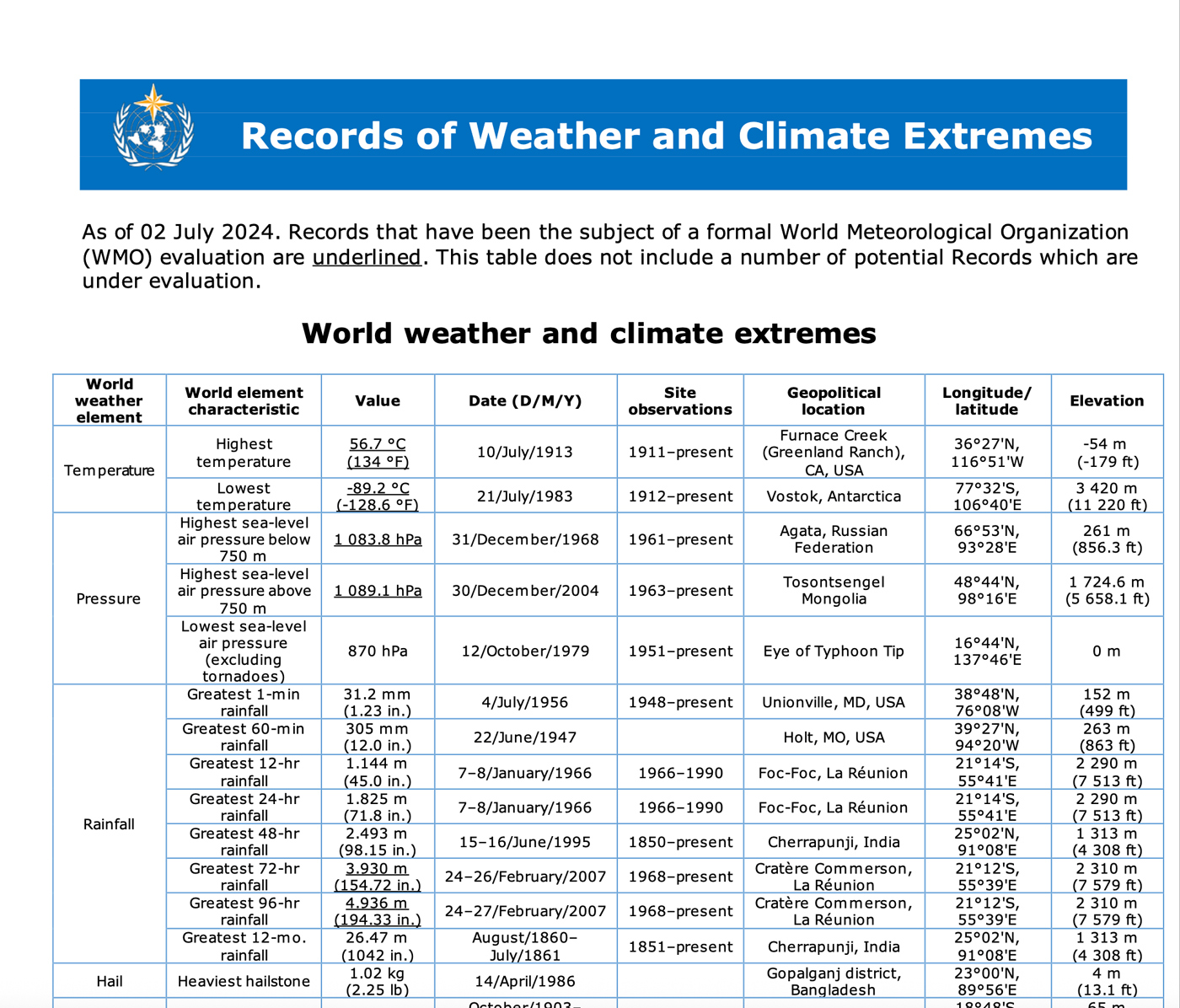 Above, on the left, is the carbon copy of the original climate form from Greenland Ranch for July, 1913. To its right is a screenshot (as of July 2025) of the WMO’s web site which shows the 134F maximum temperature as the record highest for the world (as of the summer of 2025).