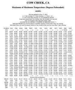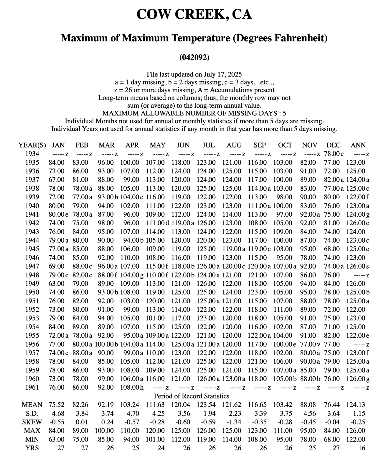 HIGHEST COW CREEK MAXIMUM TEMPERATURES