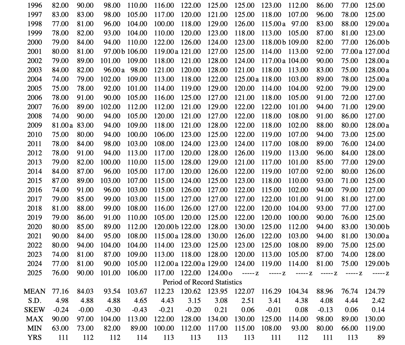 For the 22 summers from 2004 through 2025, annual maximums at Stovepipe Wells 1SW have ranged from 120.0F to 128.3F, averaging 124.0F. These values were obtained off of the station’s “monthly” summary pages.